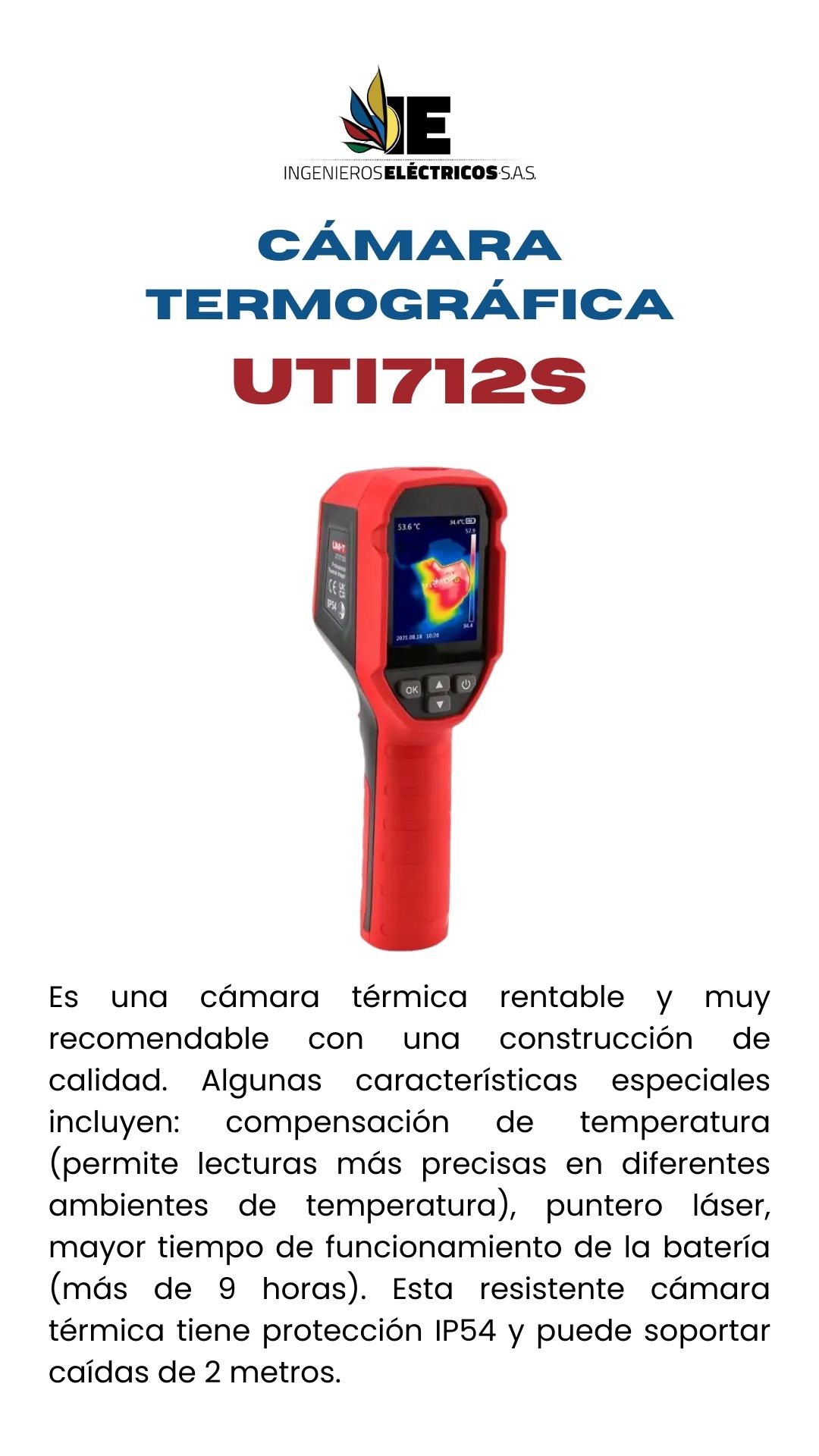 Es una cámara térmica rentable y muy recomendable con una construcción de calidad. Algunas características especiales incluyen: compensación de temperatura (permite lecturas más precisas en diferentes ambientes de temperatura), puntero láser, mayor tiempo de funcionamiento de la batería (más de 9 horas). Esta resistente cámara térmica tiene protección IP54 y puede soportar caídas de 2 metros.