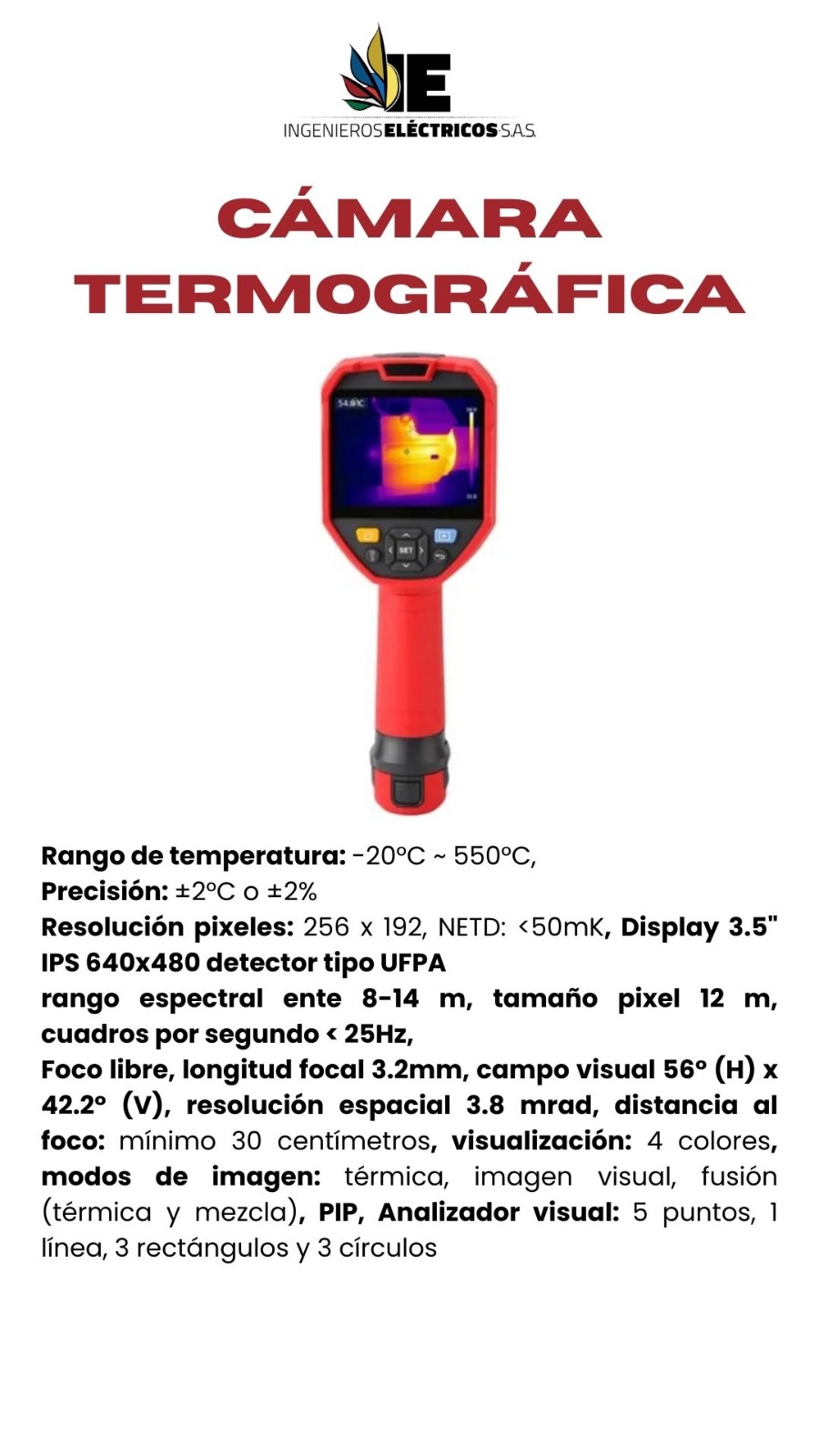 - Resolución pixeles: 256 x 192, NETD: <50mk, Display 3.5″ IPS 640×480 detector tipo UFPA. rango espectral ente 8-14 m, tamaño pixel 12 m, cuadros por segundo < 25Hz